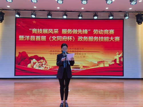 “五一”国际劳动节来临之际,为进一步提升全县行政审批和政务服务工作人员的业务技能,树牢为民服务的理念,营造爱岗敬业、争创一流、团结奋进的良好氛围,持续深化“放管服”改革,优化提升营商环境,4月28日,由县总工会和县行政审批服务局主办、县政务服务中心承办的洋县首届政务服务技能竞赛在洋县城南学校综合报告厅举行。本次竞赛以“竞技展风采 服务做先锋”为主题,副县长李洁、县总工会主席刘晓出席活动,县行政审批服务局、县公安局、县医疗保障局、县自然资源局、县税务局等单位领导担任裁判,县政务服务中心投资建设、市场准入、社会事务、公安、水电气卫、税务、医疗保障、车管所和不动产交易窗口9支代表队36名选手参加比赛,政务大厅各进驻单位、各镇(街)便民服务工作分管领导及业务人员等共计160余名干部职工观看了比赛。
