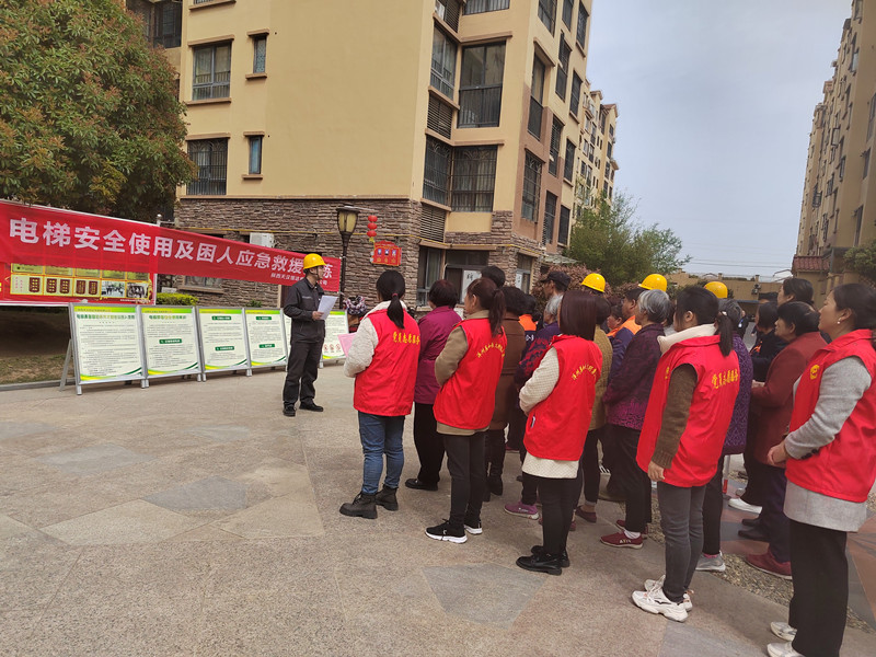 为了提高辖区居民及小区安保人员电梯应变处置、自护自救能力及安全意识,4月7日,洋州明珠社区联合缙颐天下城小区物业、电梯维保公司在天下城小区9号楼广场开展了“关注电梯安全共建平安社区”主题活动。