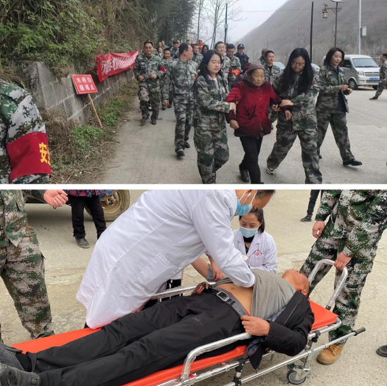 生命至上筑屏障,地质灾害“练为战”。距离防火演练场200米的山腰处,另一场惊心动魄的地质灾害实战演练同步进行。“地质监测点报告,西河村八组滑坡点出现位移!”随着红色预警信号响起,镇应急指挥部立即启动抢险应急预案。在现场统一指挥下,应急抢险队伍快速分成应急抢险组、灾害预警组、物资保障组、医疗救助组、安全警戒组、宣传报道组开展抢险救援工作。西河村50余名群众在村干部带领下,沿着预定路线有序撤离至避险安置点。医疗组当场为“伤员”进行应急处置和救治,后勤组发放应急物资并对受惊群众进行安抚......整个演练过程忙而不乱、有条不紊,所有参练人员分工明确、配合默契、严格服从指挥、反应迅速、处置有效,达到了预期效果。