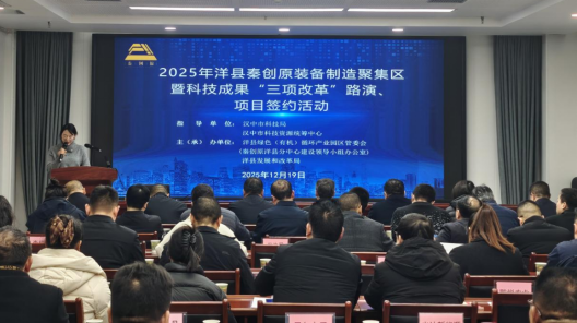12月19日,由汉中市科学技术局和汉中市科技资源统筹中心指导,洋县绿色(有机)循环产业园区管委会(秦创原洋县分中心建设领导小组办公室)和洋县发展和改革局主办的洋县2025年秦创原装备制造聚集区暨科技成果“三项改革”路演、项目签约活动在洋县有机大厦举行。