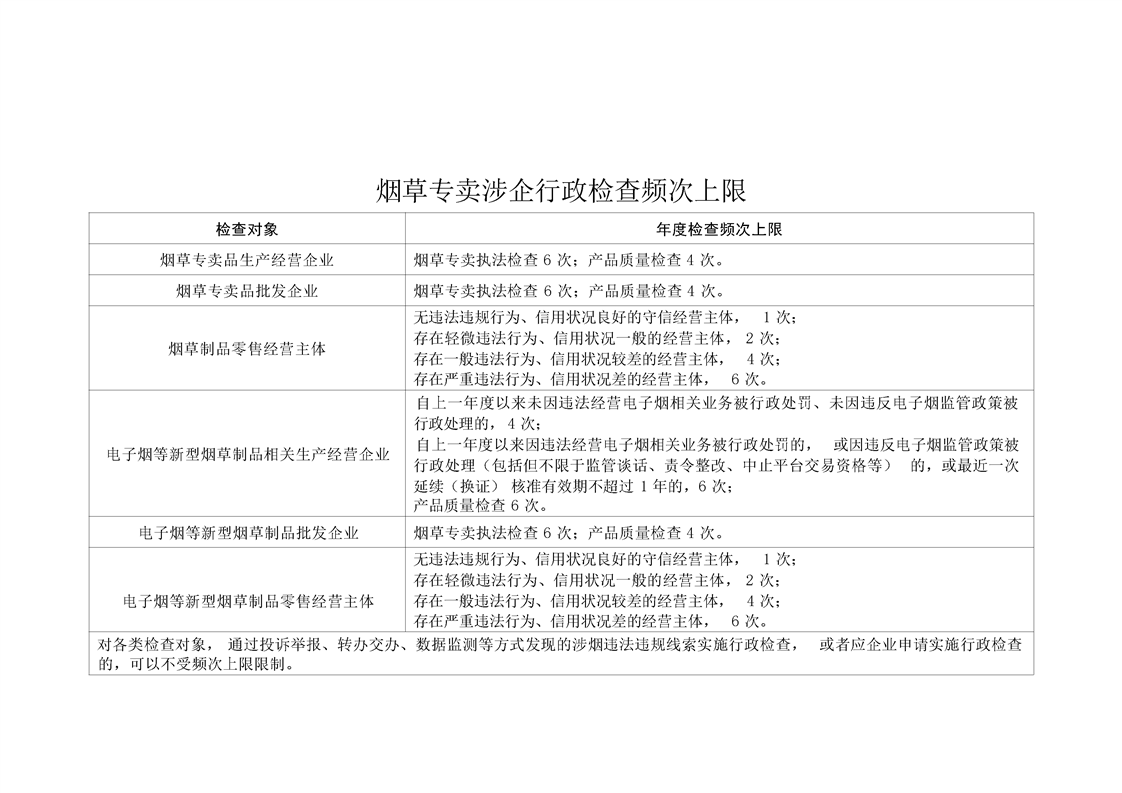 烟草专卖涉企行政检查频次上限