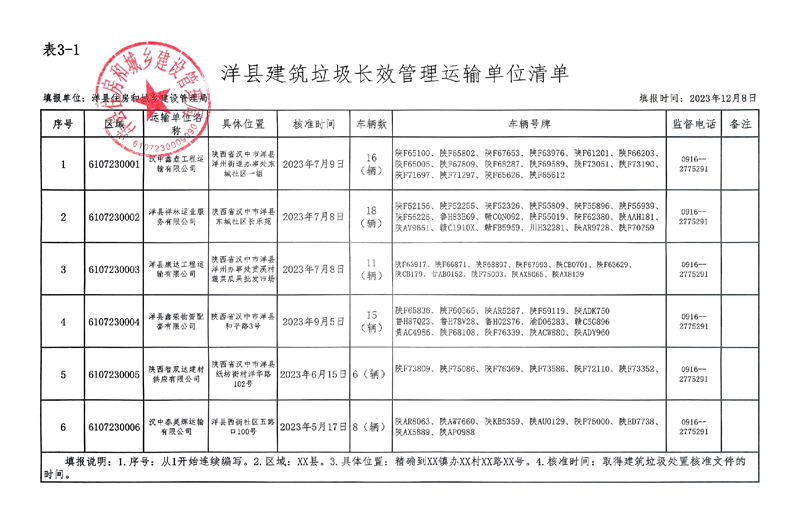 洋县建筑垃圾长效管理运输清单