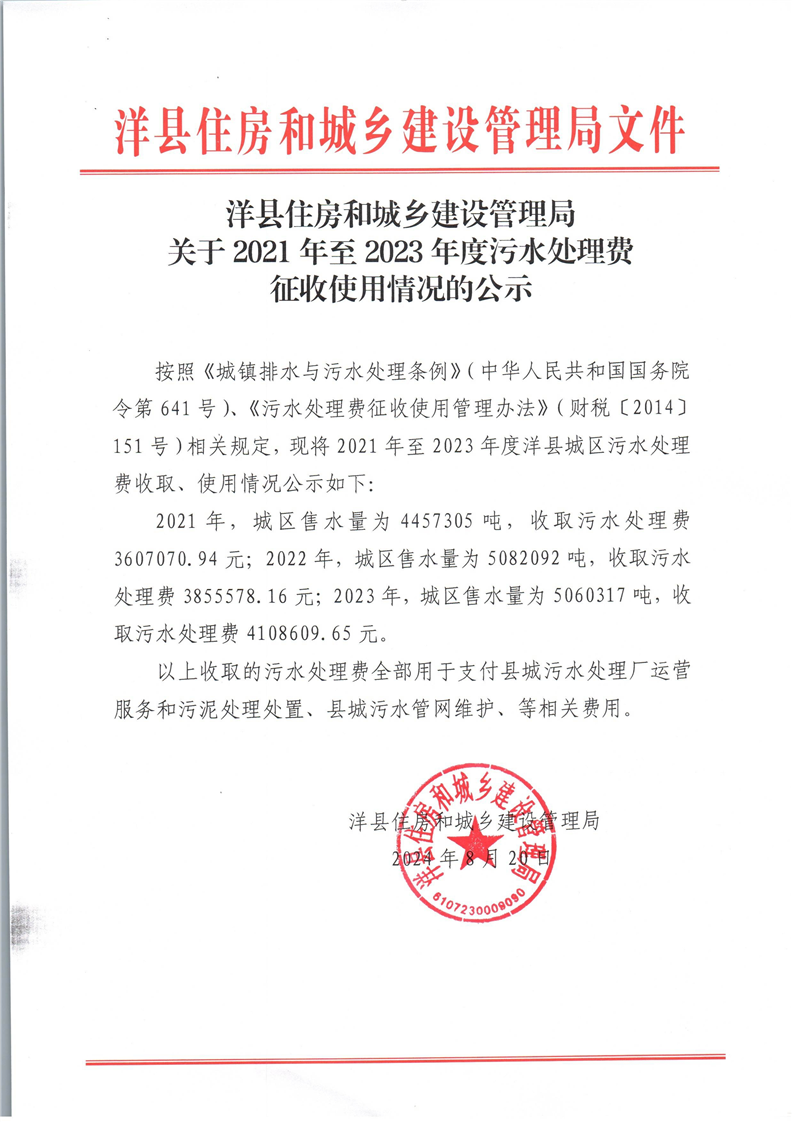 关于2021年至2023年度污水处理费征收使用情况的公示