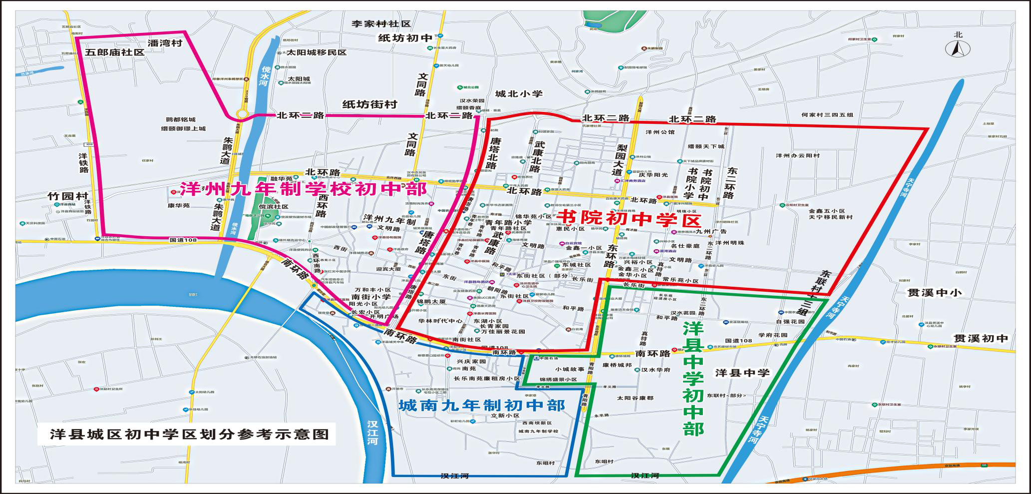 洋县中学初中部:东以天宁寺河为界,南以汉江为界,西以东环路-南环路(108路)—华美路—孝义路—青阳路为界,北以长乐街为界(含锦绣盛景、小城故事等小区以及东咀村部分小组)。