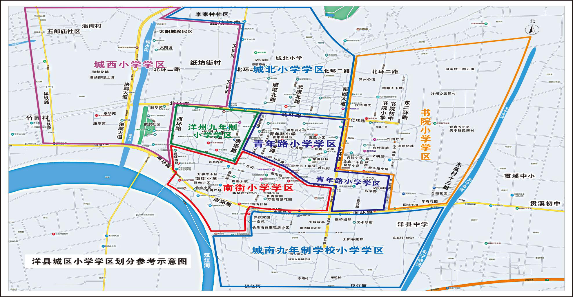 城西小学:东以洋华路—北环路西段—西环路—南环路(汉运司)转盘—旧汉江大桥北为界,南以汉江为界,西以竹园村(苎溪河)为界,北以纸坊街村—太阳城移民区—潘湾村为界。