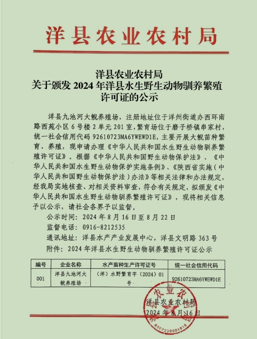洋县农业农村局关于向洋县九池河大鲵养殖场颁发2024年洋县水生野生动物驯养繁殖许可证的公示