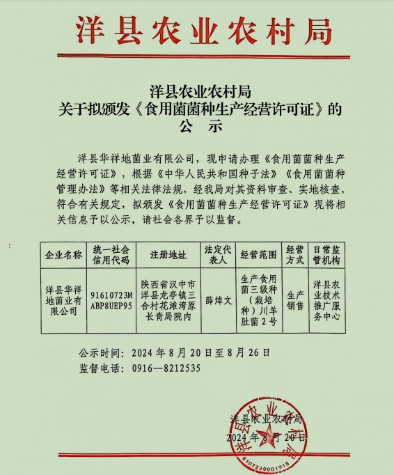 洋县农业农村局关于拟向洋县华祥地菌业有限公司颁发《食用菌菌种生产经营许可证》的公示
