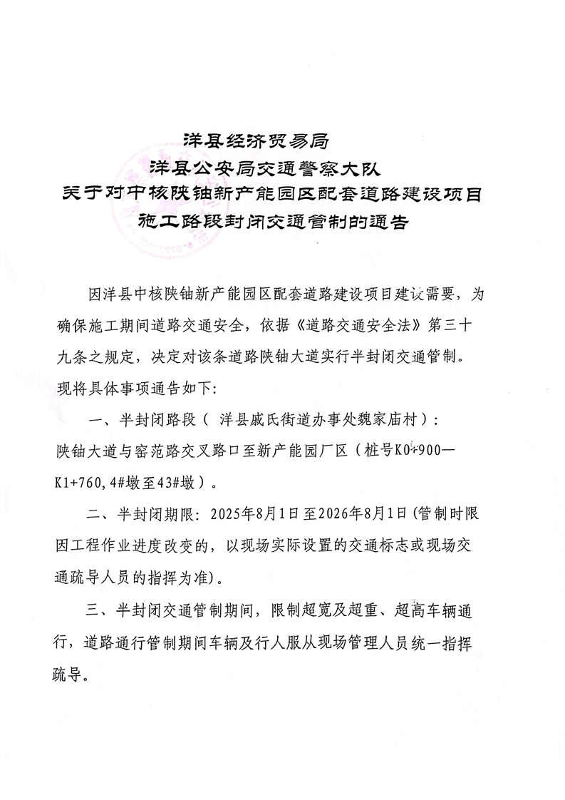 关于对中核陕铀新产能园区配套道路建设项目施工路段封闭交通管制的通告