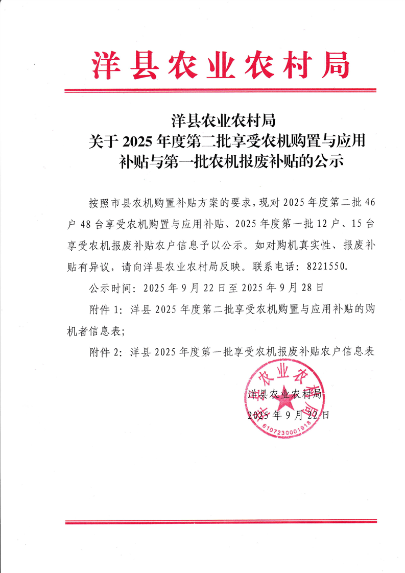内容概述 | 关于2025年度第二批享受农机购置与应用补贴与第一批农机报废补贴的公示 |