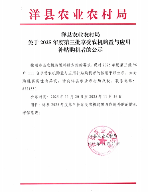 | 内容概述 | 洋县农业农村局关于2025年度第三批享受农机购置与应用补贴购机者的公示 | ||||