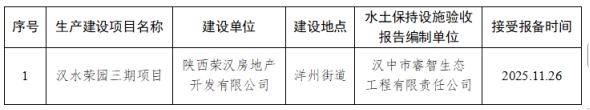根据《国务院关于取消一批行政许可事项的决定》(国发〔2017〕46号)、《水利部关于加强事中事后监管规范生产建设项目水土保持设施自主验收的通知》(水保〔2017〕365号)、《水利部办公厅关于印发生产建设项目水土保持监督管理办法的通知》(办水保〔2019〕172号)、《水利部办公厅关于进一步加强部批项目水土保持监管工作的通知》(办水保〔2024〕57号)有关规定,2025年11月16日—2025年12月15日我局接受了1个生产建设项目水土保持设施自主验收的报备。现予以公告,公告期为2025年12月16日—2025年12月22日。