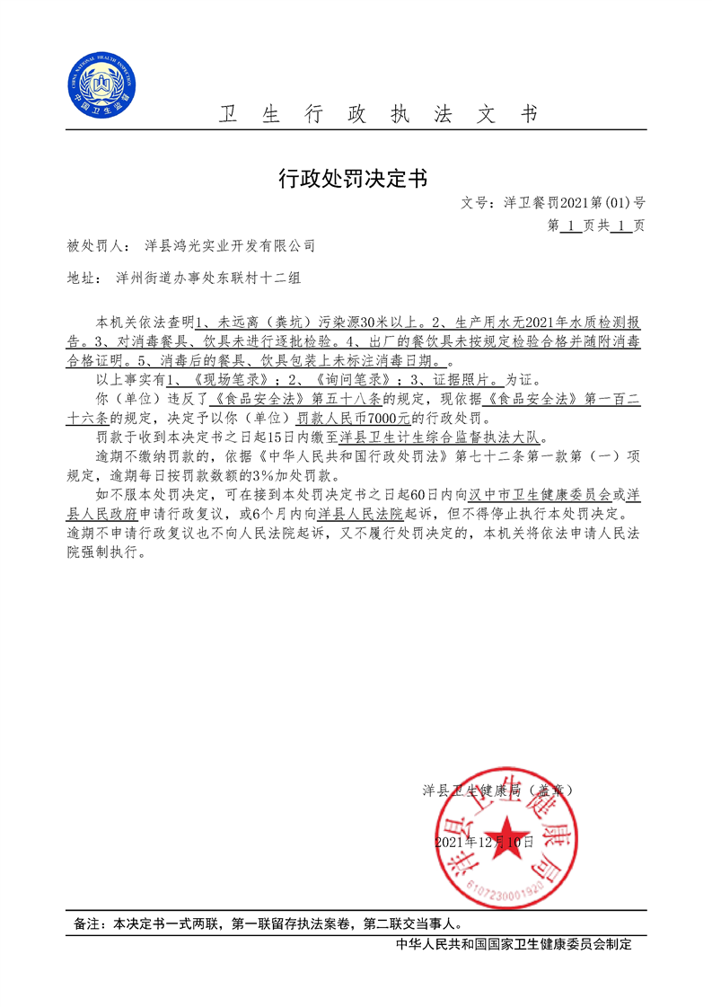 卫生健康行政处罚信息公示(洋卫餐罚2021第01号)