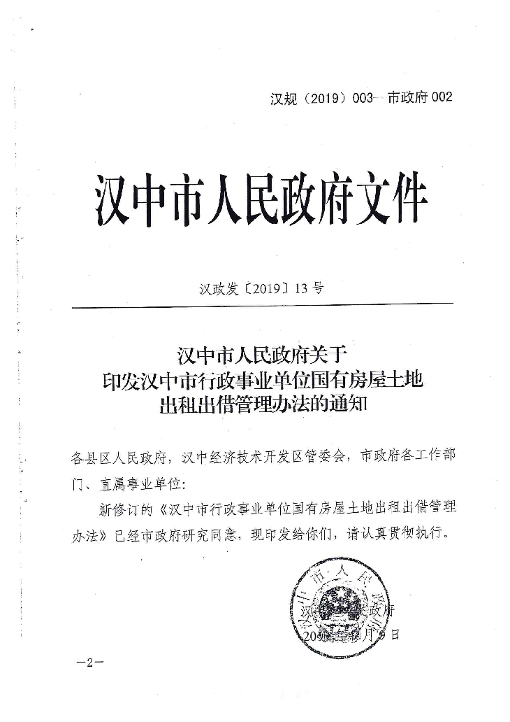 现将《汉中市人民政府关于印发汉中市行政事业单位国有房屋土地出租出借管理办法的通知》(汉政发〔2019〕13号)转发给你们,请认真贯彻执行。