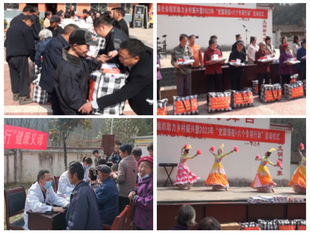启动仪式上,洋县社会组织乡村振兴合力团开展了“万社助万家”帮扶和“乡村行”主题两大行动,与后坝河村、白刘村、任桃村等村搭建形成“点对点”“一对一”“多对一”的帮扶关系,为200多名迟暮老人和孤残老人发放价值10万元的优质棉被、床上四件套、电子血压计、唱戏机等爱心帮扶礼包。洋县新健康老年公寓联合新健康医院为后坝河村开展健康义诊90余人次,音乐家协会党员志愿服务队舞蹈《繁花似锦》、女生独唱《小康时光》、秦腔《打不尽豺狼绝不下战场》等文化展演,宣传党的政策,弘扬社会正气,提振了重点帮扶村干群乡村振兴的士气,充分展示了洋县社会组织合力团积极履行社会公益、携手推进“六个专项行动”的责任担当。受益老人感恩党的关怀,个个洋溢着幸福的笑容。