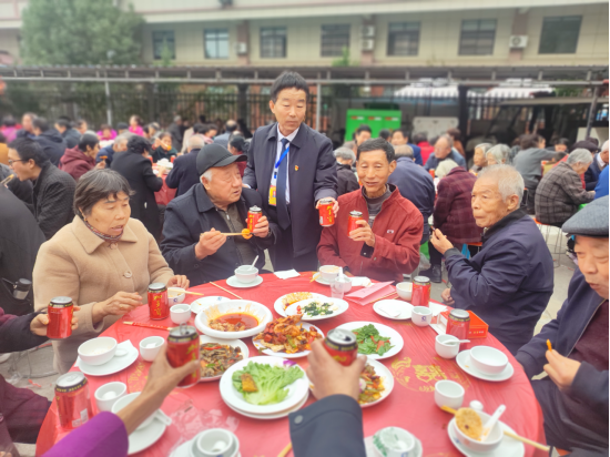 文艺演出结束后,长寿宴正式开席。社区工作人员早已提前布置好餐桌和菜肴,老人们怀着喜悦的心情陆续入座,大家围坐在一起,一边品尝着美味佳肴,一边拉着家常,分享着生活中的趣事和社区发展的变化。“社区每年都记得我们这些老人,不仅有好看的节目,还有这么丰盛的宴席,心里真暖和!”今年81岁的李爷爷激动地说,脸上洋溢着幸福的笑容。社区工作人员穿梭在餐桌之间,主动为老人们添菜、倒茶,耐心询问老人们的需求,用细致周到的服务让老人们感受到了家一般的温暖。