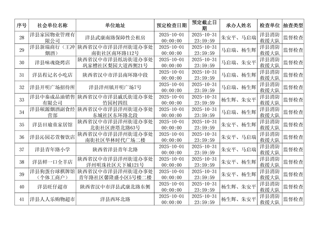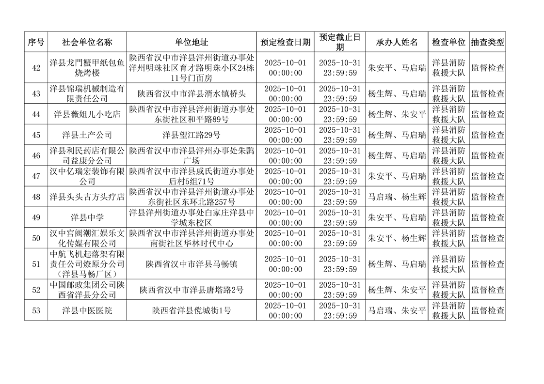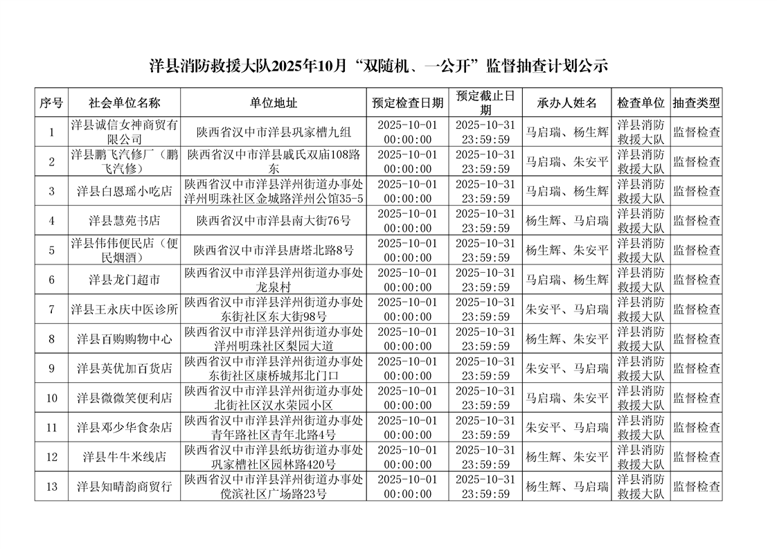洋县消防救援大队2025年10月“双随机、一公开”监督抽查计划公示