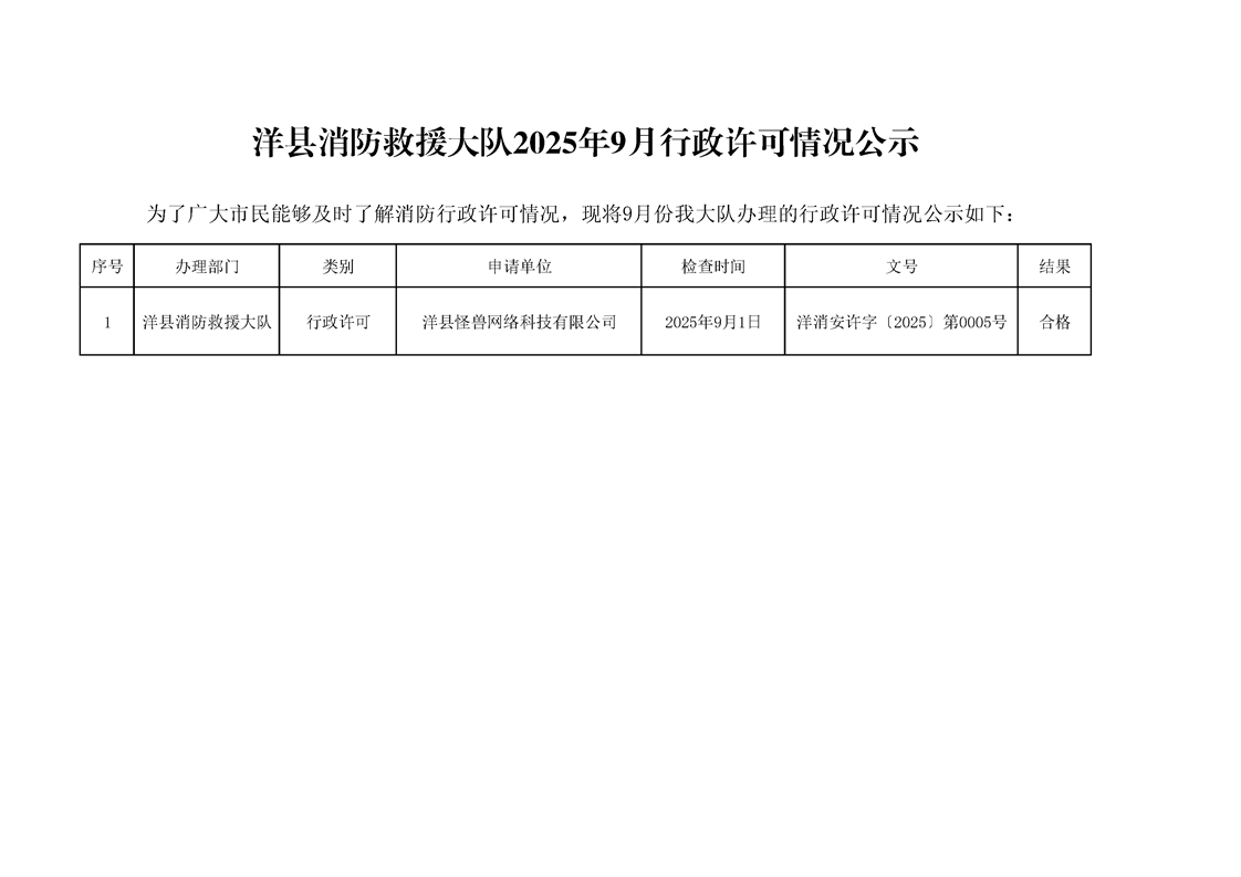 洋县消防救援大队2025年9月行政许可情况公示
