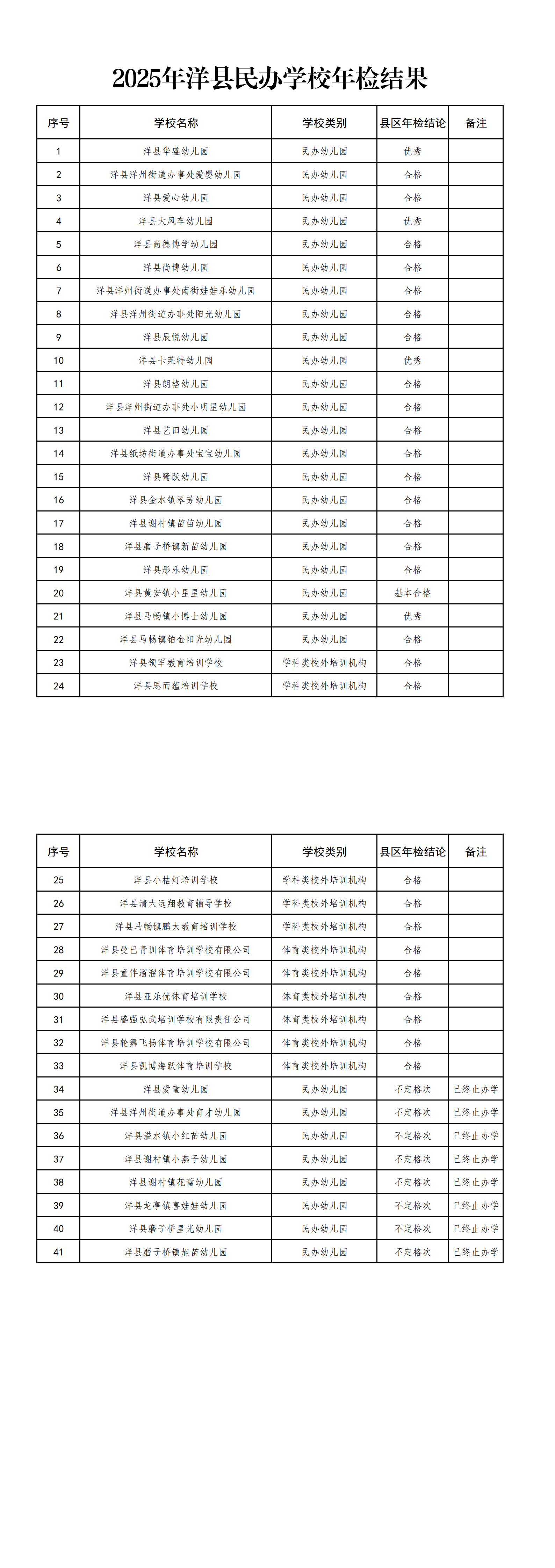 为进一步加强民办学校管理,促进民办学校规范办学,推动我县民办教育全面健康发展,根据《中华人民共和国民办教育促进法》相关要求,按照洋县教育体育局《关于开展2025年全县民办学校年检工作的通知》(洋教体发〔2026〕5号)安排,我局采用民办学校自查自评、辖区管理学校初查初审、局相关业务股室实地检查的形式对全县民办幼儿园、学科类及体育类校外培训机构进行了年检。现将年检结果予以公告。
